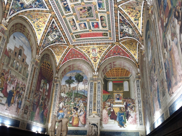Sienan katedraalin komeita seinä- ja kattonäkymiä.