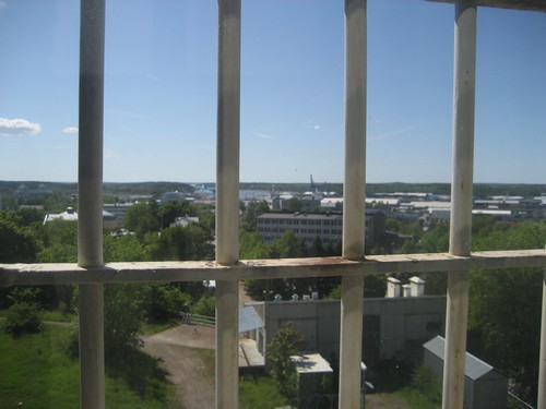Tässä neljännen kerroksen sellista näköala kohti Turun satamaa, jossa